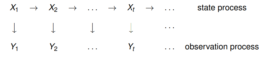 A state space model (SSM) is a time series model in which the time series $$Y\_t$$ is interpreted as the result of a noisy observation of a stochastic process $$X\_t$$. The values of the variables $$X\_t$$ and $$Y\_t$$ can be continuous (scalar or vector) or discrete. Graphically, an SSM is represented as follows: