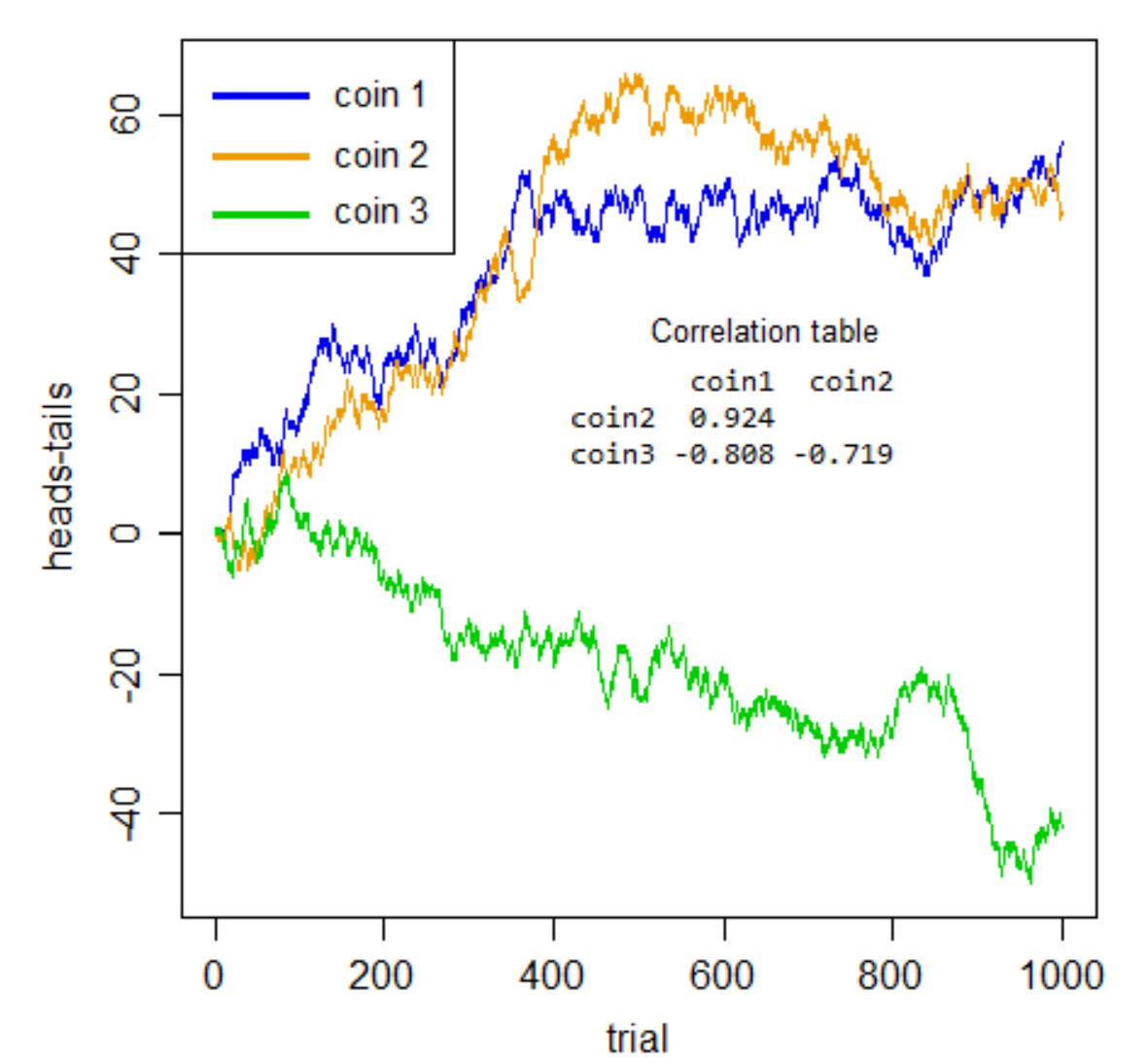 In particular, you'll probably want to look into spurious correlation. The point about spurious correlation is that series can appear correlated, but the correlation itself is not meaningful. Consider two people tossing two distinct coins counting number of heads so far minus number of tails so far as the value of their series.