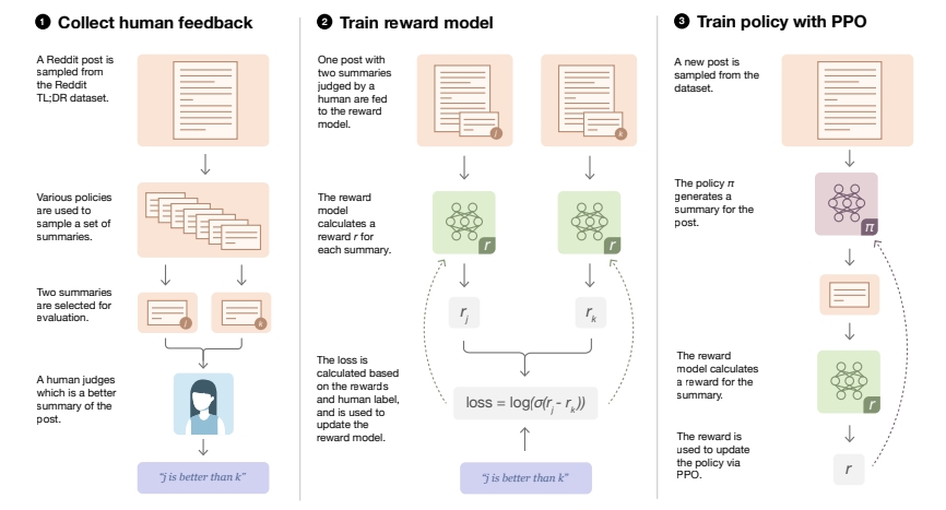 Here is an illustration of the main steps of fine-tuning an LLM with human feedback using RL, derived from the paper "Learning to summarize from human feedback, 2022" [12]