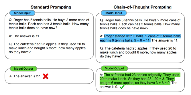 The example below, which is derived from the paper "Chain-of-Thought Prompting Elicits Reasoning in Large Language Models,2023", published by researchers at Google, demonstrates how the LLM's behavior was completely changed when a standard one-shot prompt (simply giving the answer) was replaced with a chain of thought prompt by including the reasoning steps that solve the problem. This helped the LLM succeed by implicitly asking him to mimic human behavior.