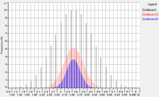 To prove the thrid point let's take a uniform distribution, in the image below $$500,000$$ times for each sample size $$(5, 20, 40)$$ have been drawn and their mean plotted. We’d expect the average to be $$(1 + 2 + 3 + 4 + 5 + 6 / 6 = 3.5)$$. The sampling distributions of the means center on this value. Just as the central limit theorem predicts, as we increase the sample size, the sampling distributions more closely approximate a normal distribution and have a tighter spread of values.