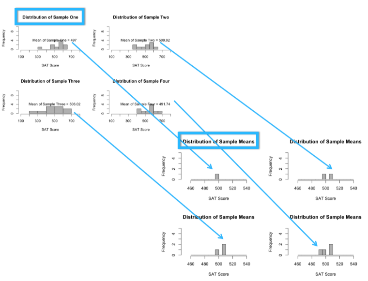 * You take a sample of $$10$$ random students from a population of $$100$$. You might get a mean of $$502$$ for that sample.